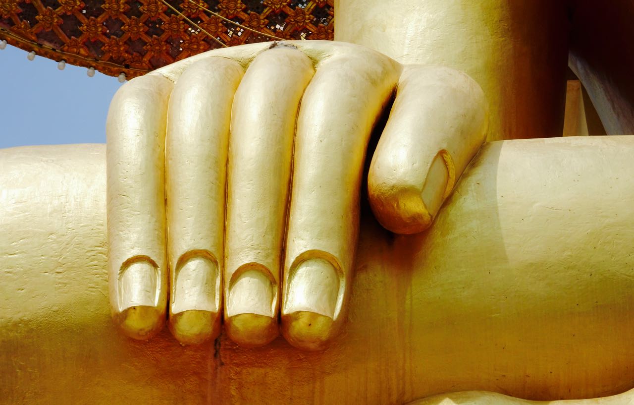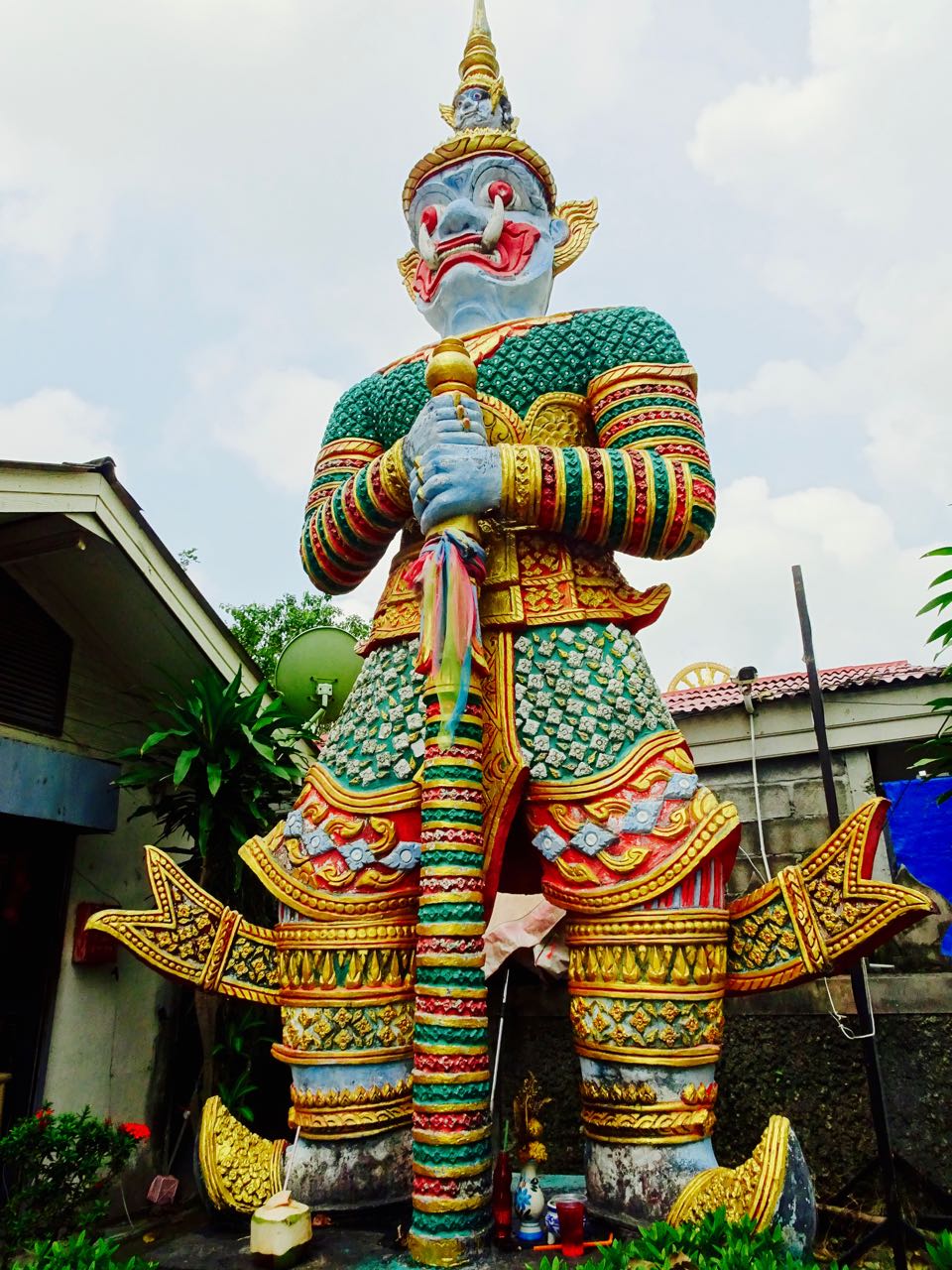 Un Bouddha de 12 mètres de haut, tout d’or vêtu. Voilà ce que l’on aperçoit de très loin avant d’arriver sur le site qui se situe au Nord-Est de l’île de Koh Samui. Avant de découvrir de plus près cette majestueuse statue, il faut passer devant ses gargantuesques gardiens – Yaksha – qui protègent l’entrée des mauvais esprits. Impressionnés, nous poursuivons et découvrons dès la partie basse du temple l’imposant Bouddha assis en méditation.