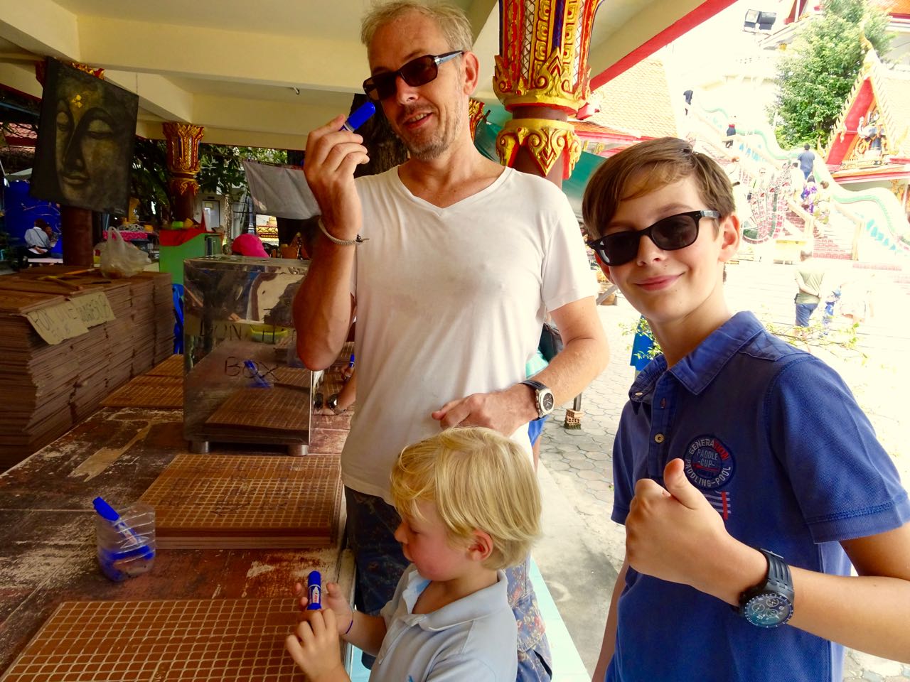 Avant de quitter cet endroit, nous voulons partager avec les enfants deux traditions qui nous tiennent à coeur. Faire un don d’abord. Le temple nécessite beaucoup de travaux. Nous n’avons d’ailleurs malheureusement pas pu faire sonner les cloches pour cause de rénovation.