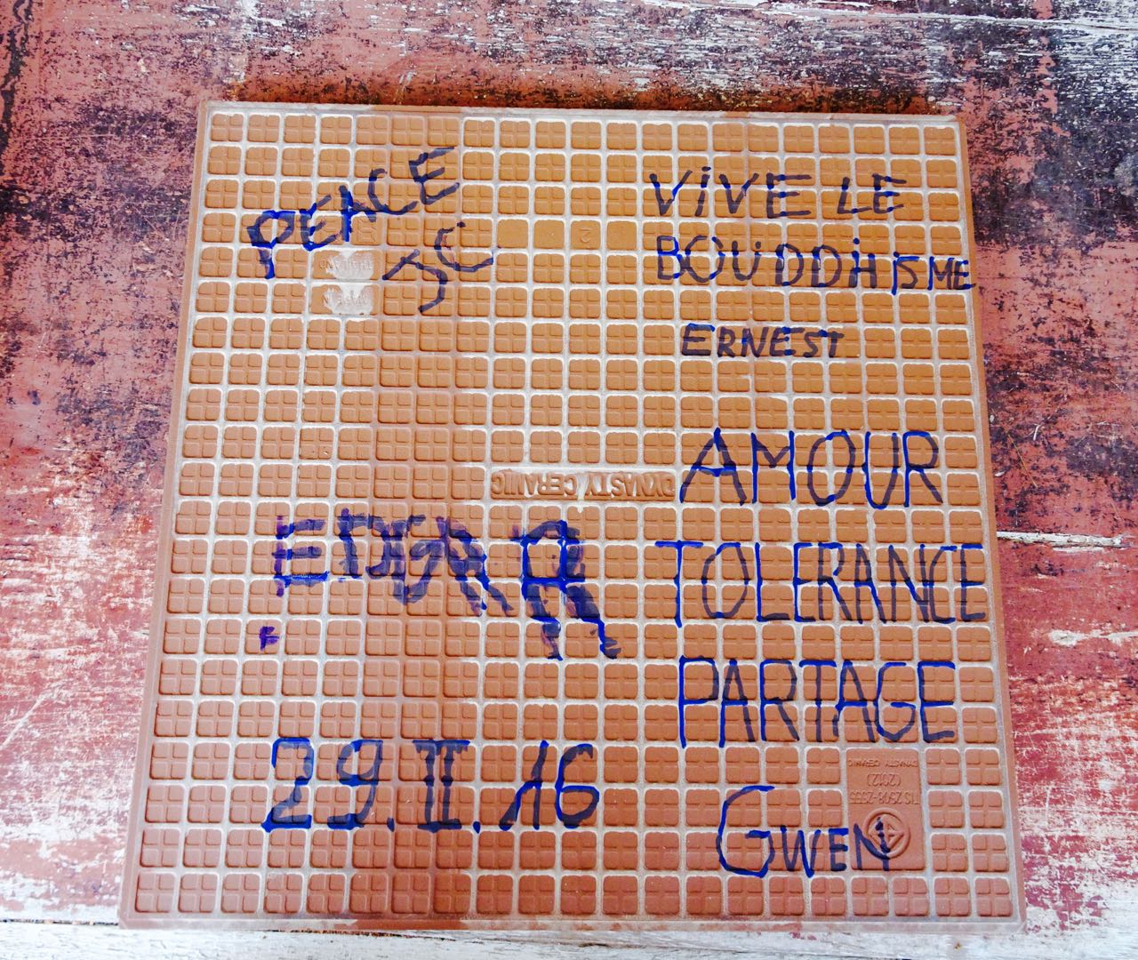 Puis acheter une tuile pour servir à l’entretien du temple. Nous pouvons y inscrire un mot.